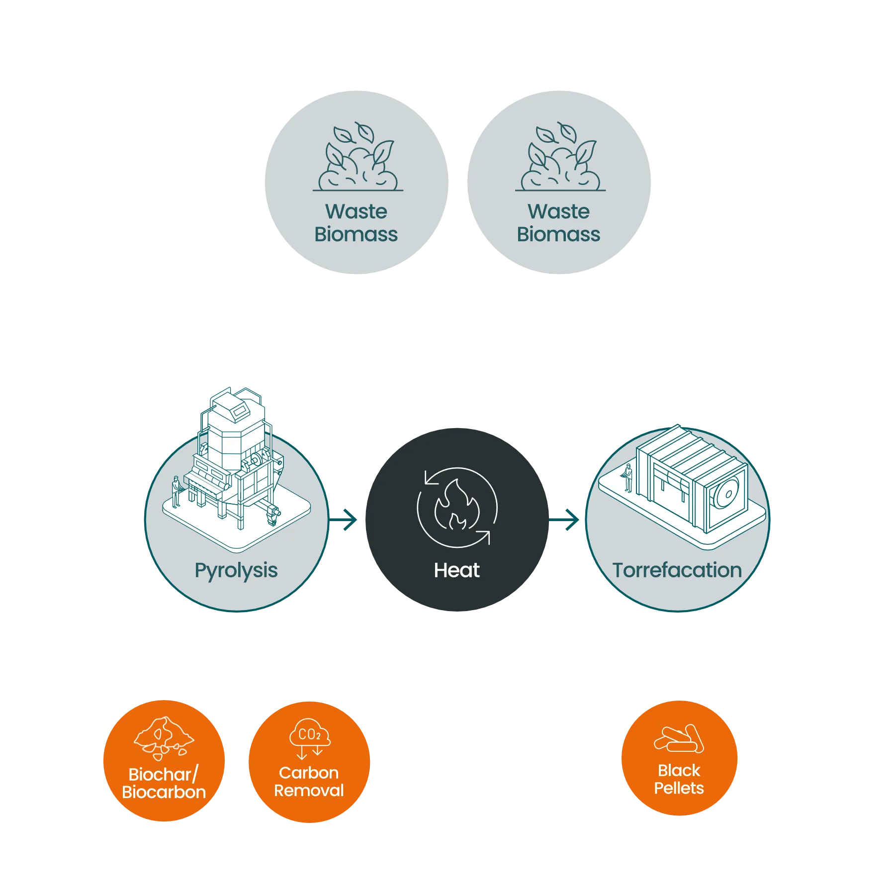 We are proud to partner with leading innovators to build breakthrough technologies that transform biomass into high value renewable commodities like biochar, black pellets and biocarbon. By leveraging advanced processes like pyrolysis and torrefaction, we not only address the problems of disposing of organic waste but also remove carbon from the atmosphere. Our collaborative efforts focus on optimizing these cutting-edge technologies to create reliable, low-carbon solutions that drive the transition to a more sustainable, circular energy future.